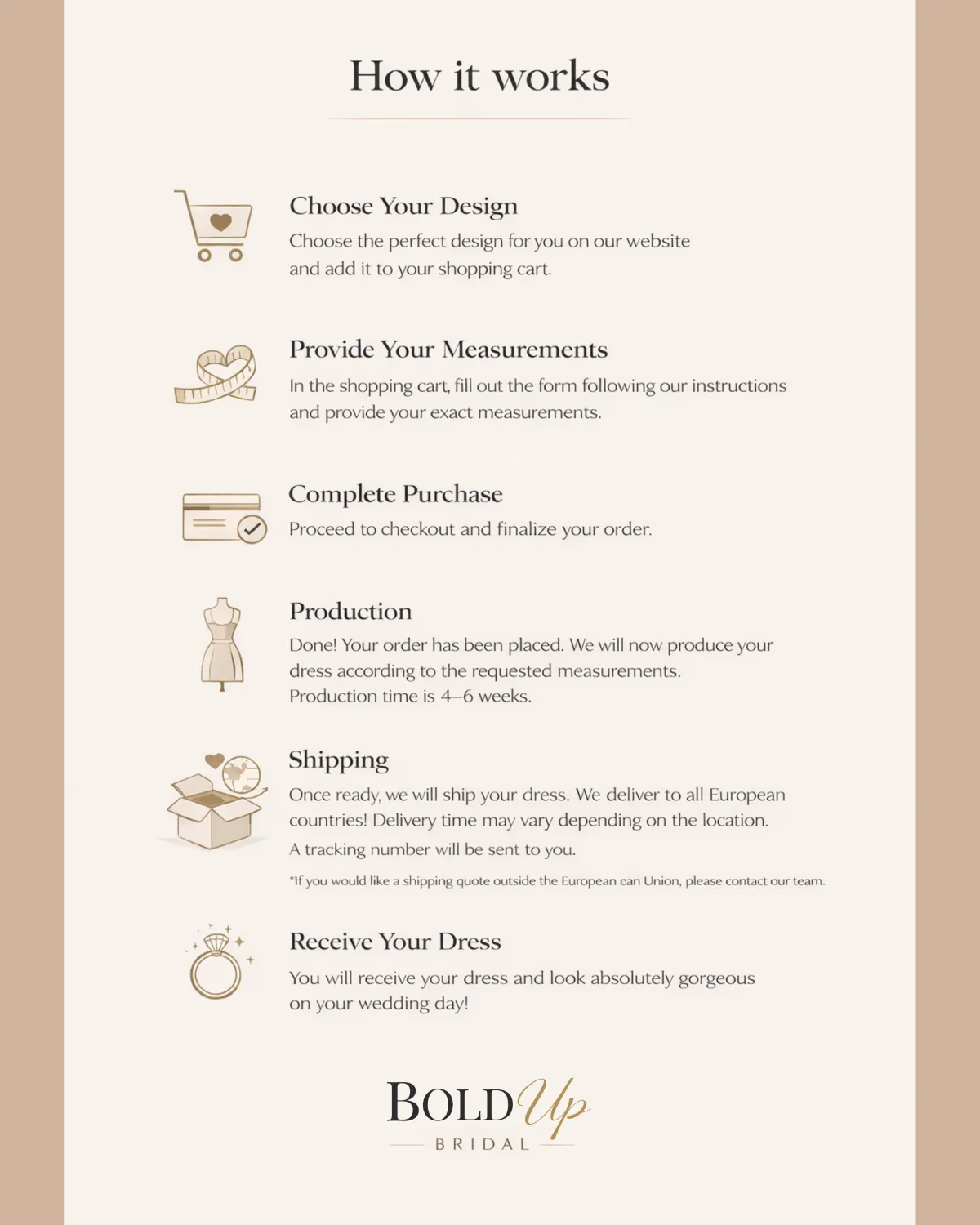 Bold Up gowns are made according to the measurements provided by the client and are therefore considered custom-made items. For this reason, and in compliance with current European Union legislation, returns or exchanges due to a change of mind are not possible. Exceptions apply only in cases of manufacturing defects or non-conformity, which must be reported within 48 hours of receipt.